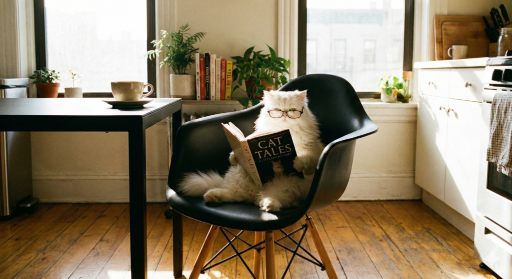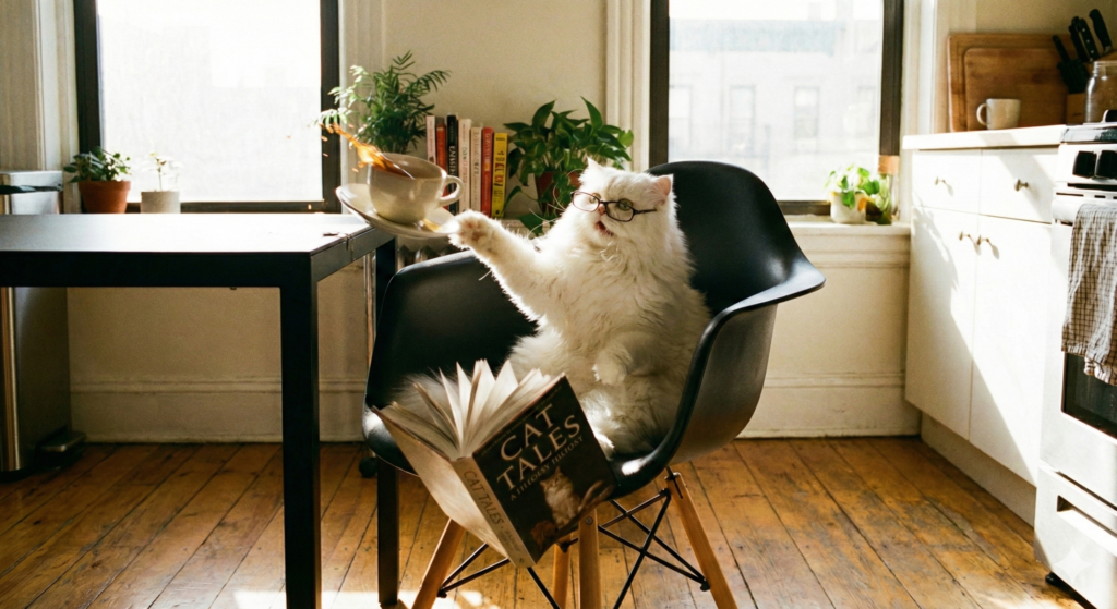Frame 1: “A fluffy white Persian cat sitting on a sleek black chair in a sunlit kitchen, reading a book. There is a cup of coffee on the table next to the chair. “