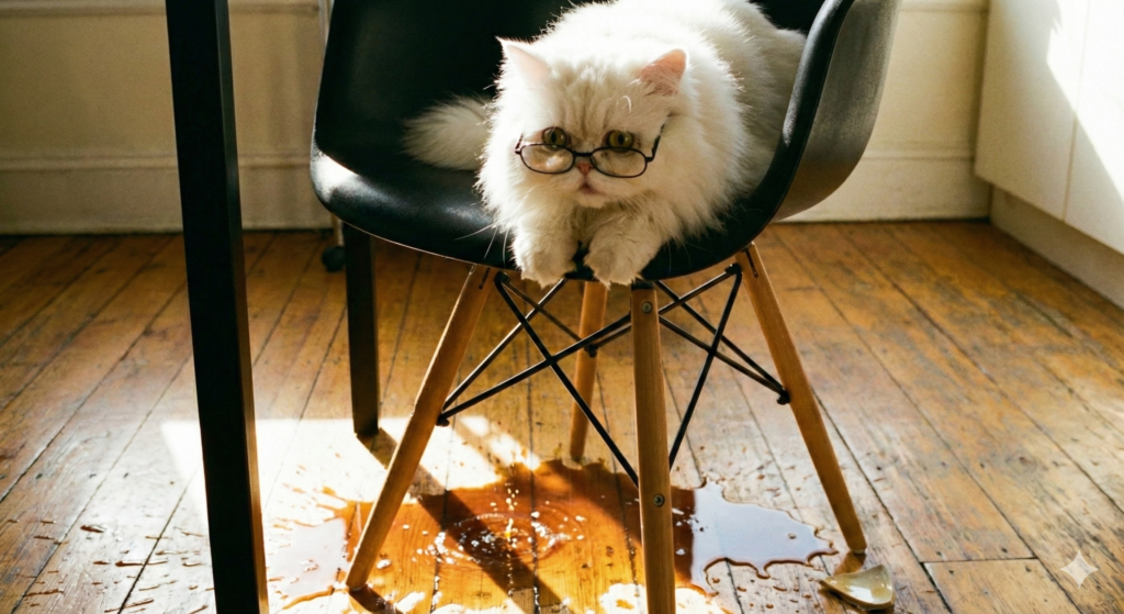 Frame 3: “Close up of the white Persian cat peering anxiously over the edge of the black chair at a spilled puddle of coffee on the floor.”